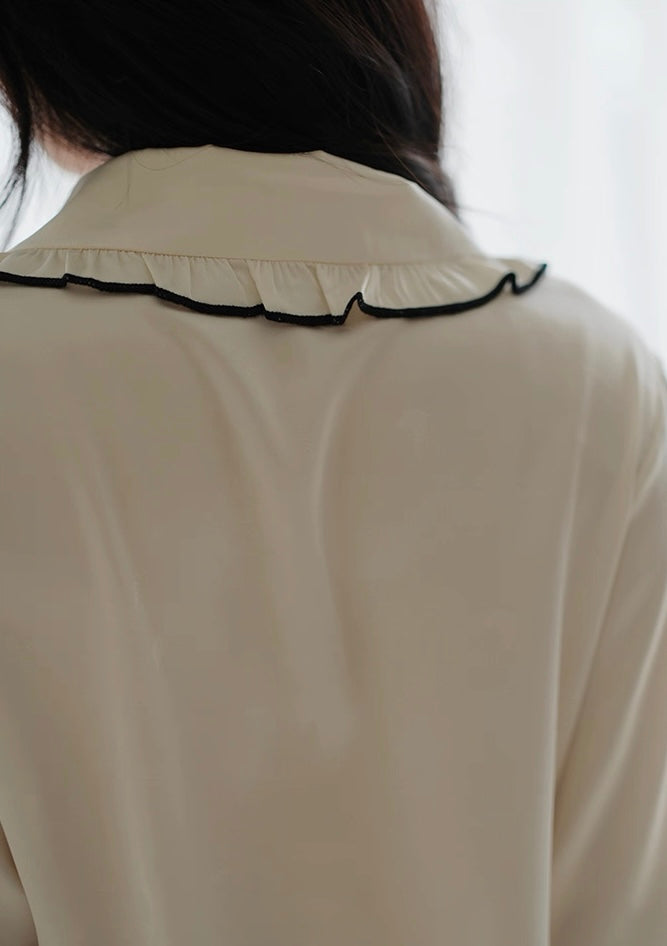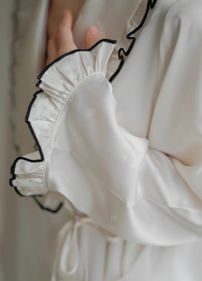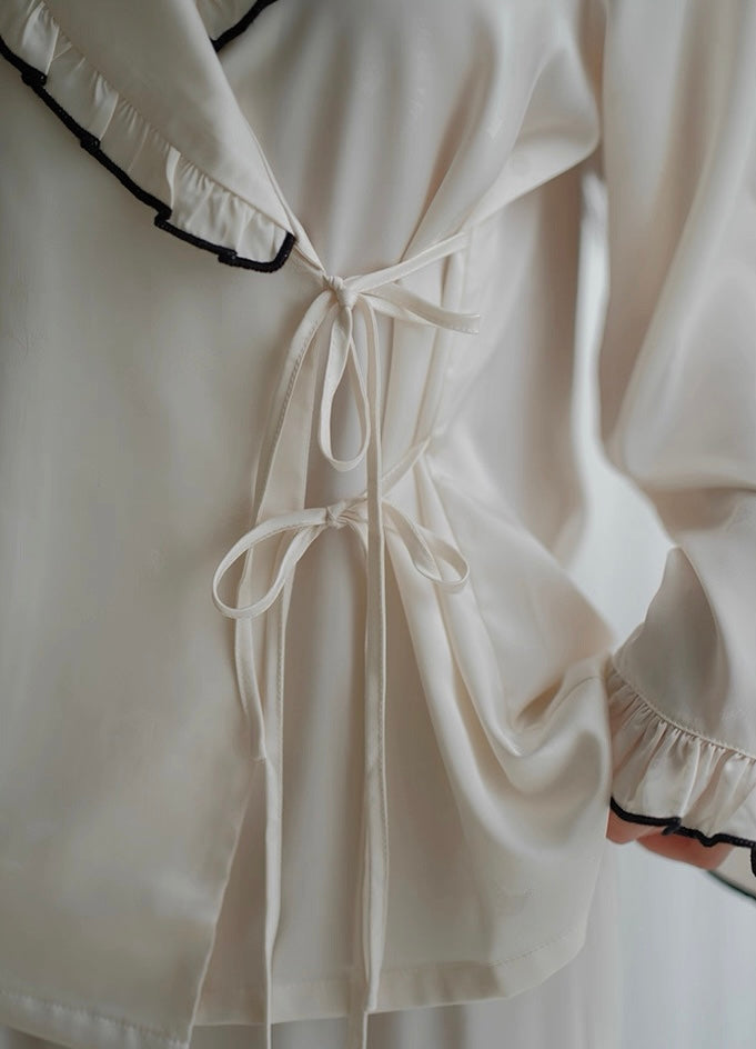 Indulge in sophisticated comfort with this Classic Black Satin Pajama Set. Crafted from high-quality silk-like poly-satin, this set features a relaxed, flowing, long-sleeve and pants silhouette designed for ultimate lounging ease. The signature details are the charming white ruffled trim elegantly lining the shawl collar, cuffs, and pant hems, offering a unique vintage feel.