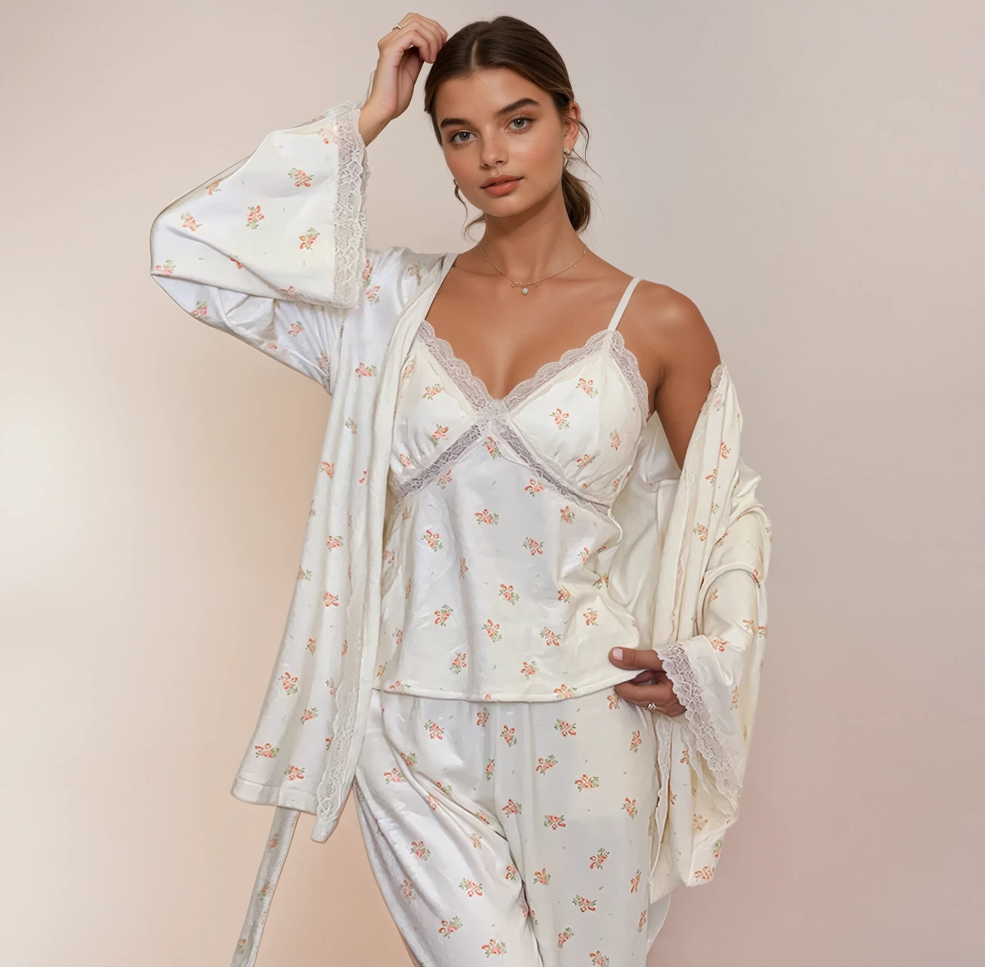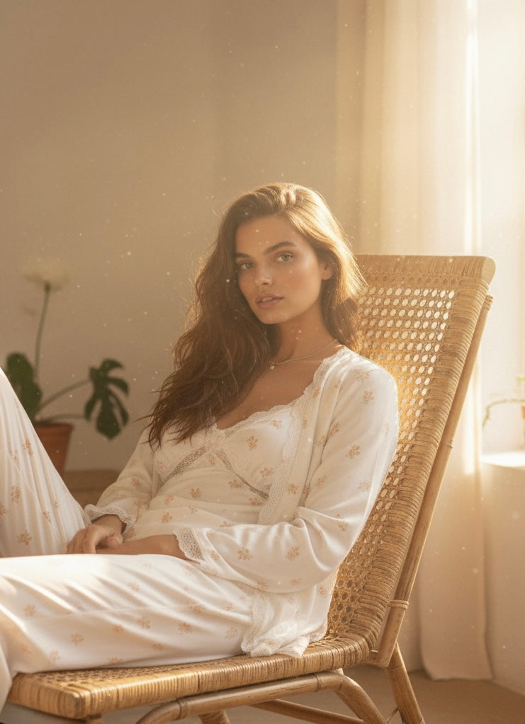 Indulge in an evening of unparalleled comfort and elegance with The Peony Dream Set, a luxurious three-piece ensemble designed to envelop you in soft, silken bliss. This beautiful set captures the essence of romantic, timeless sophistication, making your nightly ritual feel like a visit to a five-star boudoir. The delicate lace trim and charming floral print evoke a sense of graceful femininity, promising sweet dreams and stylish mornings.