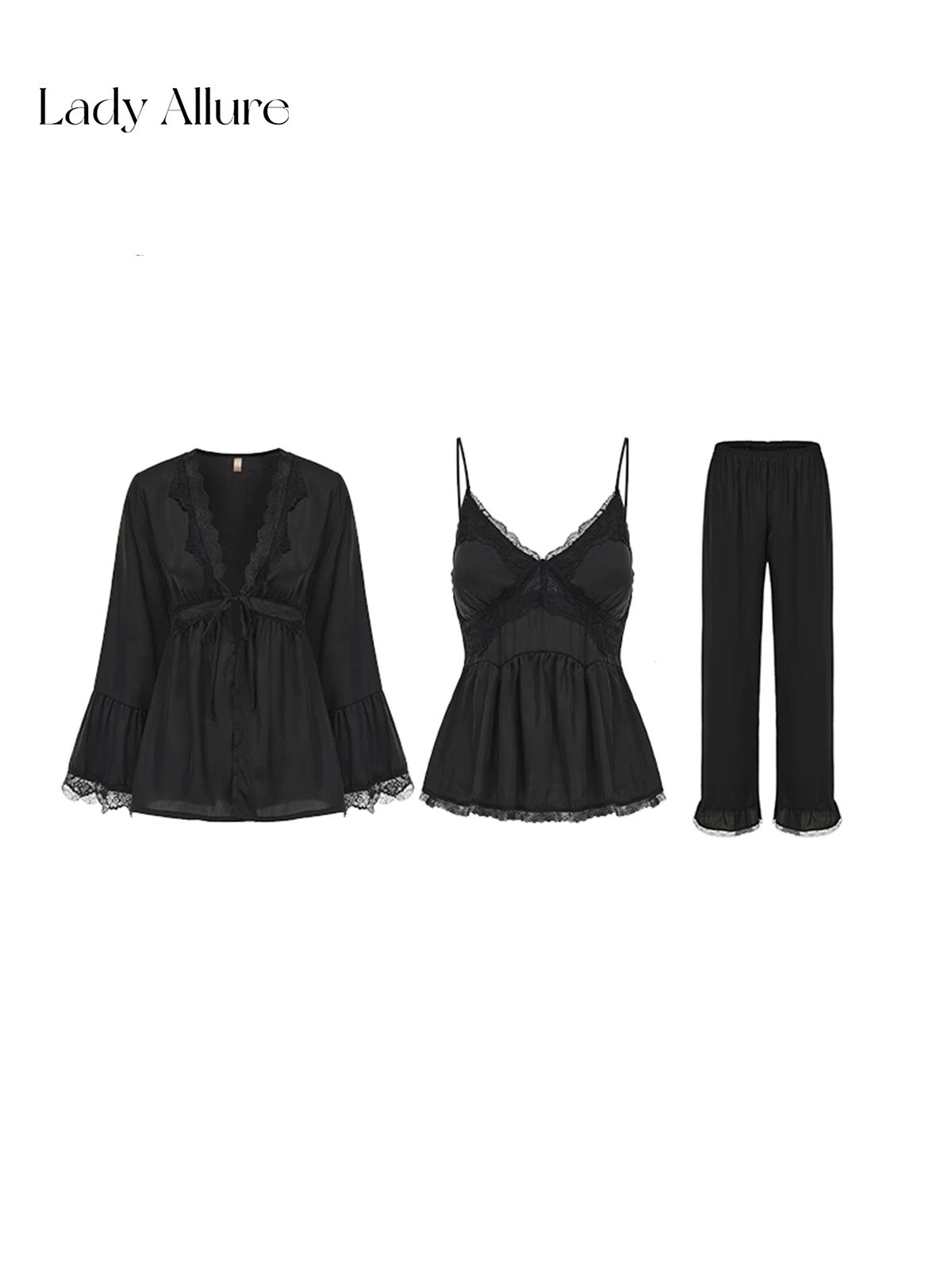 Indulge in effortless elegance with our Midnight Grace Lace Camisole Set. Crafted from lustrous satin and finished with delicate lace, it drapes beautifully for a touch of quiet luxury. The lace-trimmed camisole pairs perfectly with the matching robe, featuring flared sleeves and lace cuffs for a refined, feminine finish.