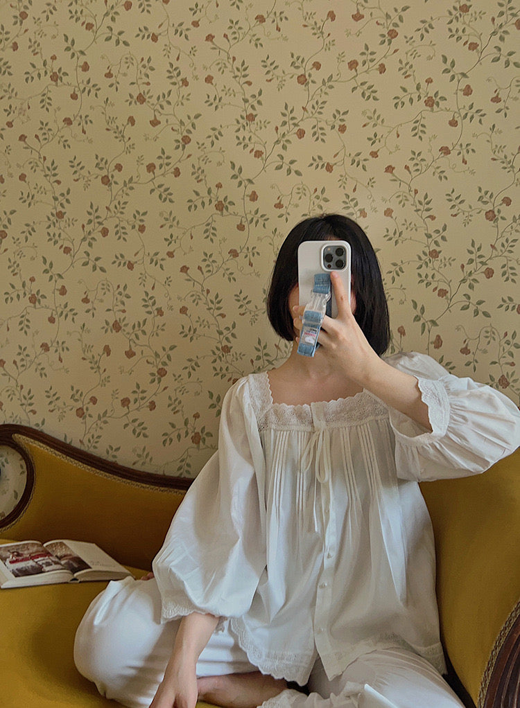 Bring elegance into your everyday routine with this Vintage White Lace Loungewear Set, designed in soft peony-gauze cotton for a dreamy, airy feel. With delicate lace trim and a gently flowing silhouette, this set blends comfort with refined beauty — perfect for lounging, relaxing, or simply feeling adorable at home.
